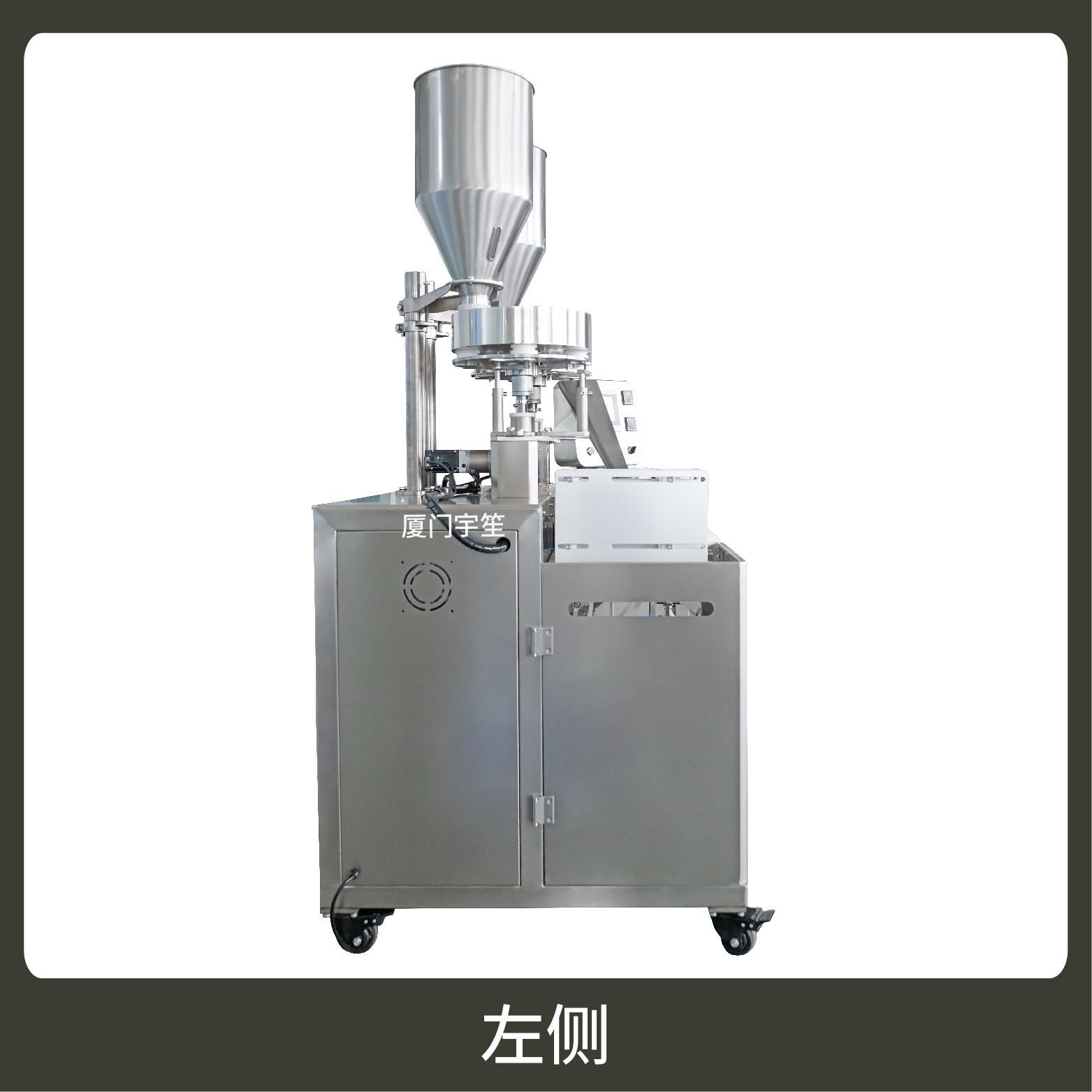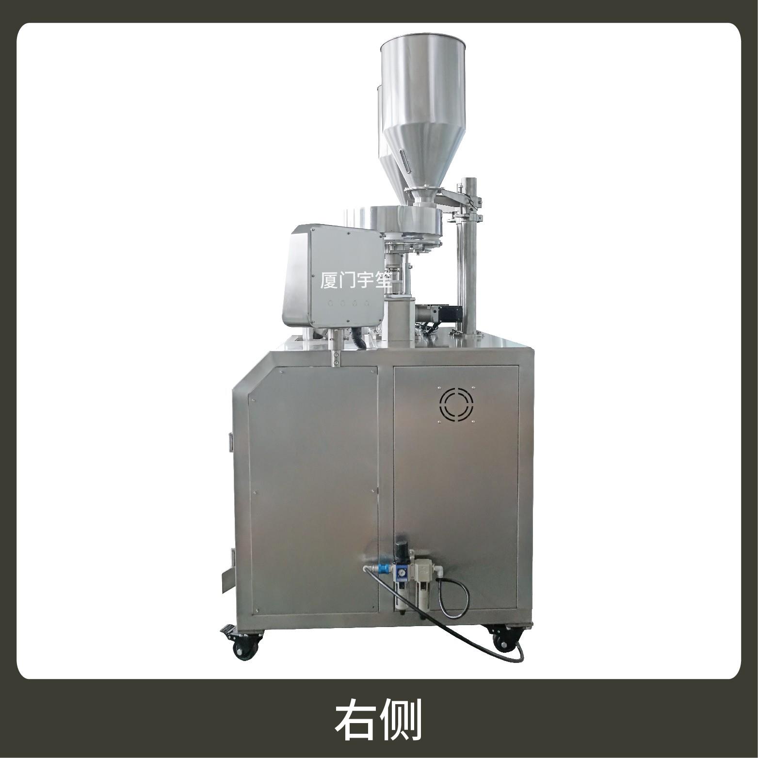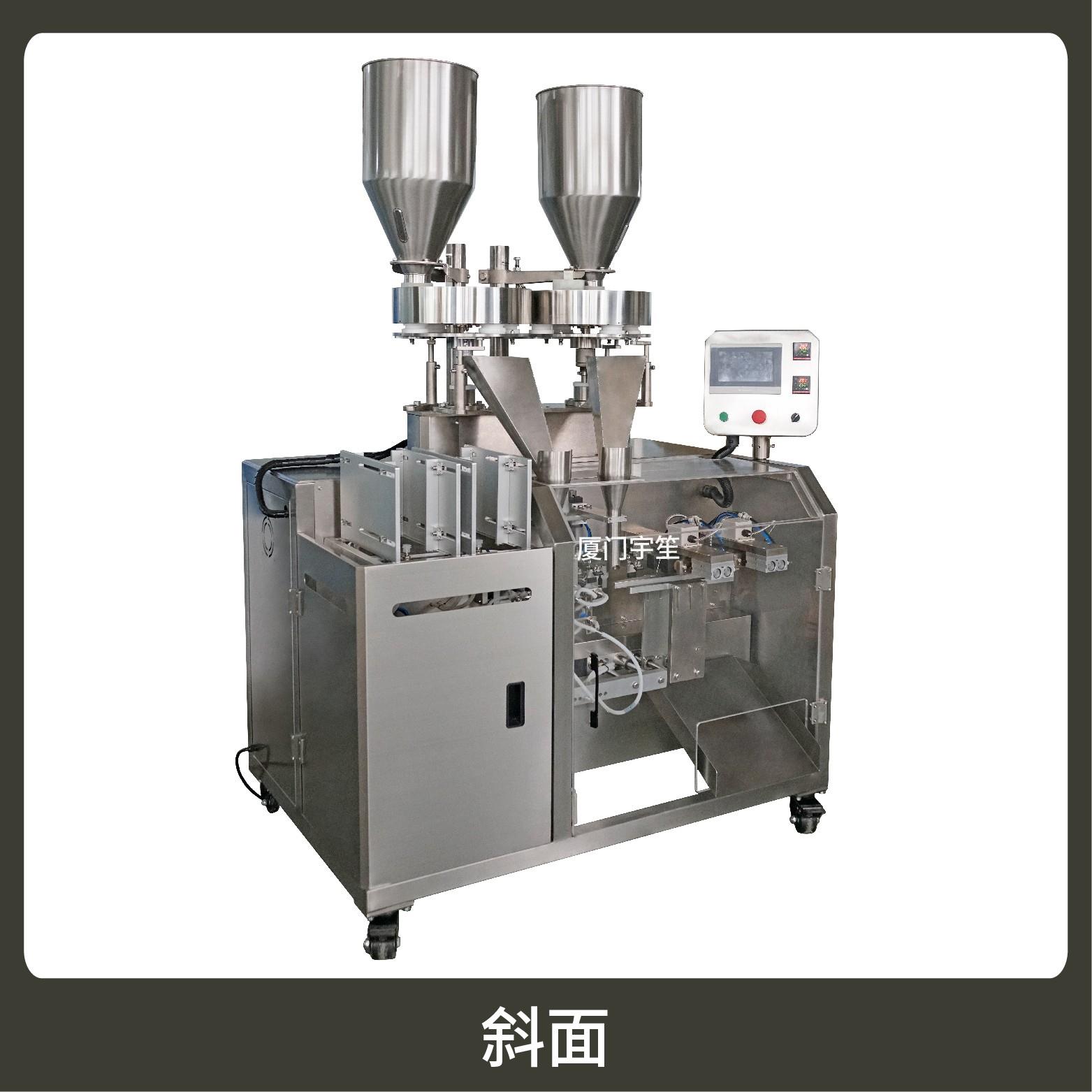2、成品雙出,速度快,包裝流程全自動,無需人工操作??筛鶕?jù)充填物料的性質(zhì)選配不同的下料結(jié)構(gòu)。